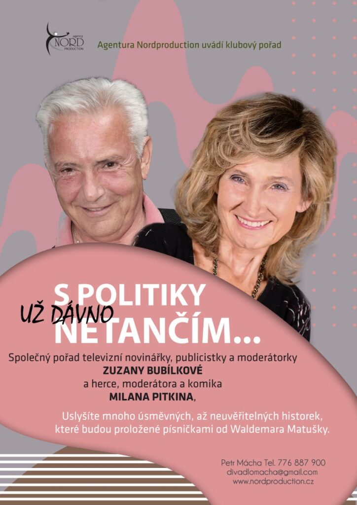 AGENTURA NORDPRODUCTION NABÍZÍ POŘAD ZUZANA BUBÍLKOVÁ S POLITIKY UŽ DÁVNO NETANČÍM…ZUZANA BUBÍLKOVÁ je česká komička, televizní novinářka, publicistka a moderátorka.Pořad je plný úsměvných historek a vyprávění.Hostem pořadu může být MILAN PITKIN, který zpívá písničky od Waldemara Matušky a vypráví mnoho vtipů.
